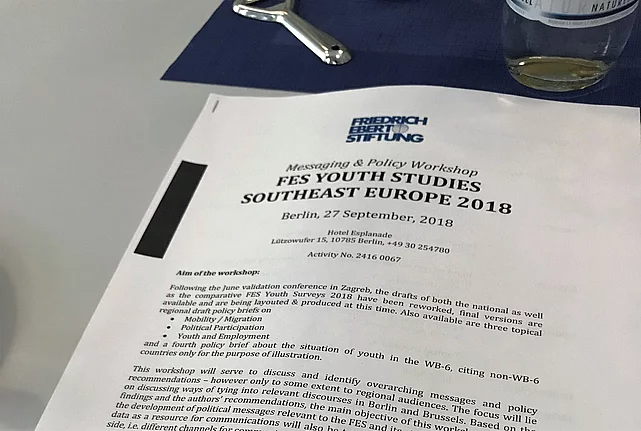 Event News Social and Economic Justice FES Youth Studies 2018: Messaging Workshop Berlin 27.09.2018 An FES workshop was organized in Berlin on 27 October 2018 with the aim to continue reflections on the main findings of the Youth Studies, which were simultaneously conducted in 10 countries of Southeast Europe during 2018. Before next year’s official and public launch of the studies, the workshop in Berlin was organized with the aim to formulate messages and to reflect on an outreach strategy as well as on methodological issues. Unlike a previous meeting in Zagreb, the meeting in Berlin was attended only by FES staff and the authors of the regional comparative report. Given that the drafts of both the national as well as the comparative report are being currently in the final drafting phase, the main objective of this workshop was to start the development of political messages relevant to the FES and its stakeholders. The workshop was opened by inputs from Brussels and Berlin on what the major interest for stakeholders regarding youth and Southeast Europe might be. Issues such as migration and education (including exchange programs) were highlighted, but ‘traditional’ topics such as the rule of law, corruption, democracy featured high on the agenda as well. Next year’s European Parliament elections will play a crucial factor, but also in Germany a new migration law for the Western Balkans is currently being prepared, increasing the political relevance of the Youth Studies. During the discussion on the actual study results, the precarious position of youth in the labor market, social inequality, the acceptance of informal practices and corruption, the migration potential, political orientations of youth, and young people’s linkage to their parents’ homes, were named as the most important findings. The workshop continued with a detailed discussion and deliberation on recommendations. The following sessions focused on target groups and communication channels through which messages would be disseminated (website, infographics, videos, op-eds etc.), as well as on some crucial remaining methodological issues (where and how to store the data, under which academic conditions should the reports be published etc.). The FES Youth Studies will be published at the beginning of 2019, follow this website for updates.
